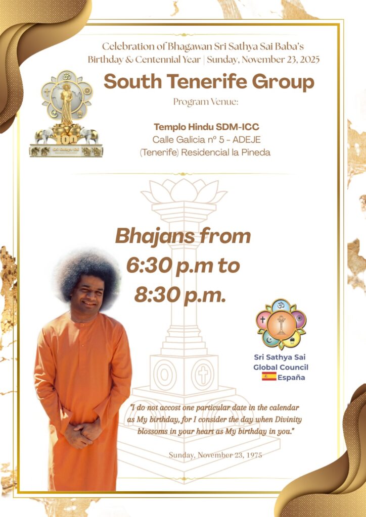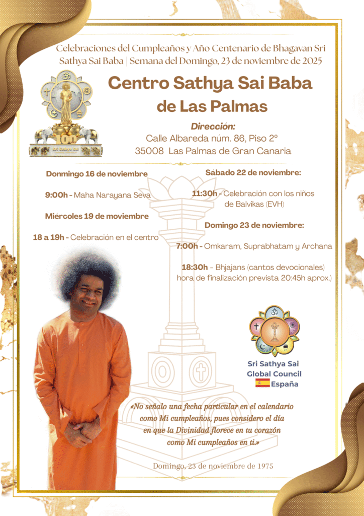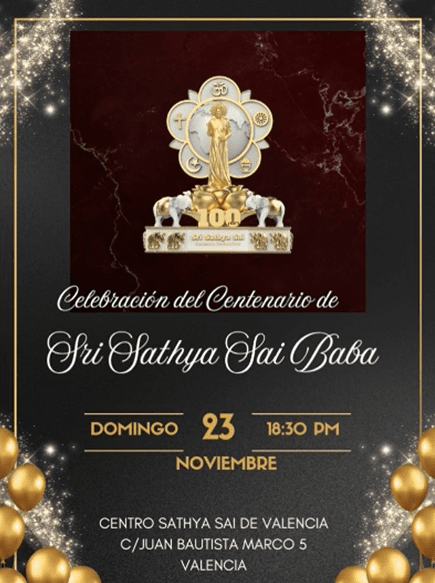 Con profunda alegría y devoción, la Organización Sri Sathya Sai Global Council España invita a todos los devotos y simpatizantes a participar en las celebraciones del Año Centenario del nacimiento de Bhagavan Sri Sathya Sai Baba, que tendrán lugar el domingo 23 de noviembre de 2025 en diferentes ciudades de España.