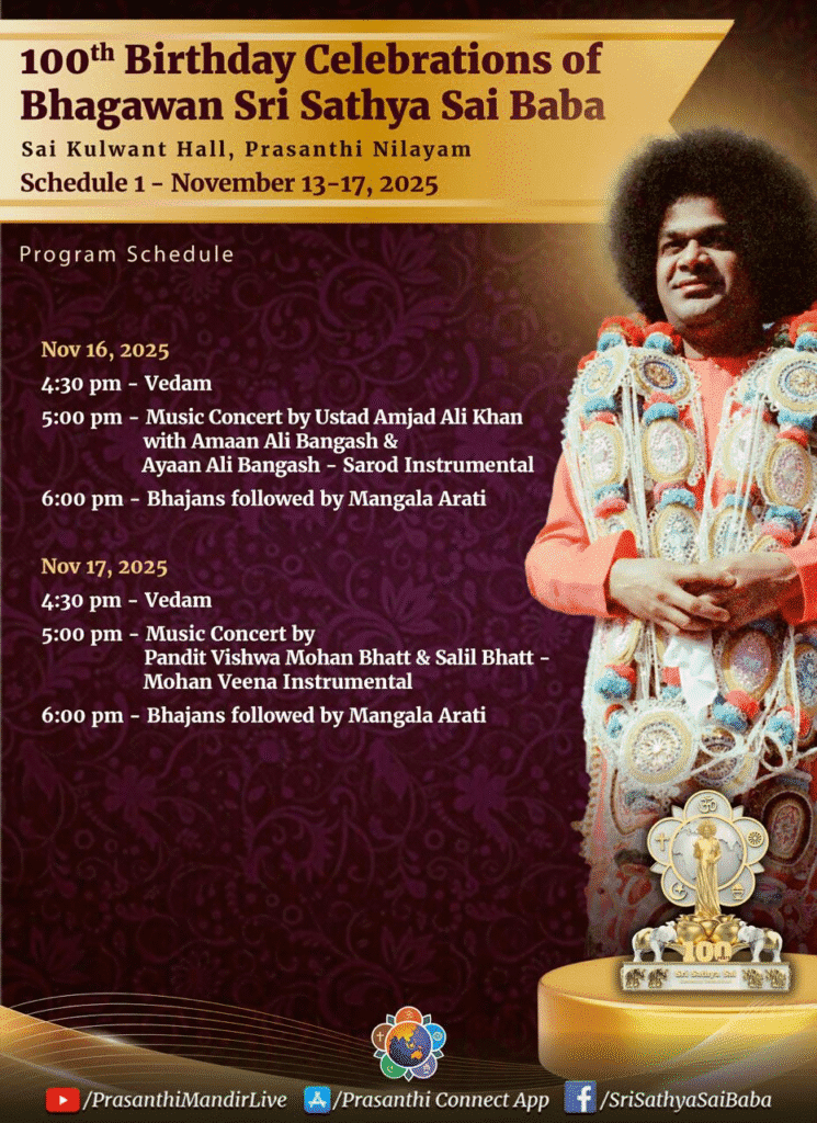 Celebraciones del centenario del cumpleaños de Bhagavan Sri Sathya Sai Baba | Horario del programa | 13-17 de noviembre de 2025 | Prashanti Nilayam