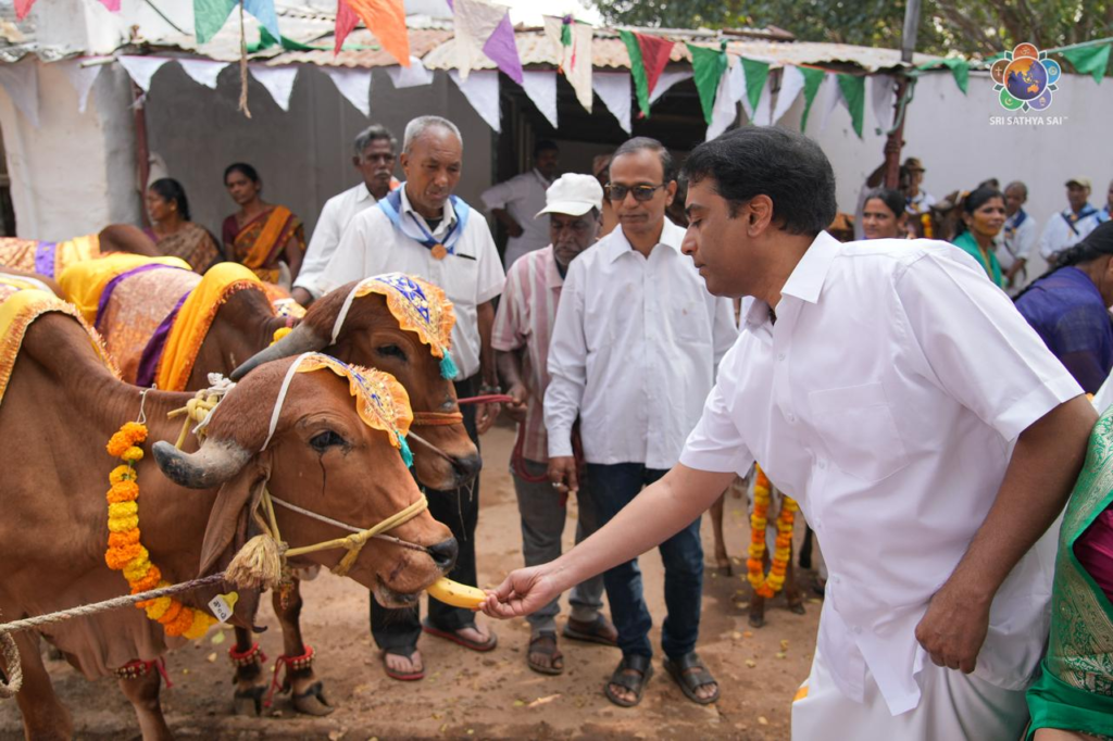 Esta iniciativa transformadora se ha planificado para implementarse por etapas, garantizando un seguimiento minucioso y un impacto sostenido. Con la bendición divina de Bhagavan, hoy se inició la primera fase del programa, marcando el primer paso en un camino más amplio hacia el empoderamiento rural. El Fideicomisario Gerente del Sri Sathya Sai Central Trust, el Sr. RJ Rathnakar, distribuyó 27 vacas Gir junto con sus terneros a beneficiarios merecedores en las instalaciones de Gokulam, en presencia de dignatarios, funcionarios y simpatizantes.