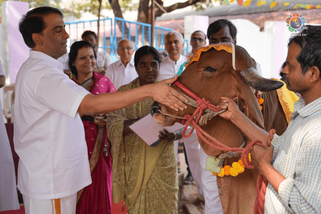 Enraizado en el espíritu atemporal de la civilización india, Go-Daan siempre ha simbolizado la compasión en acción: una ofrenda que nutre no solo al receptor, sino a la sociedad en su conjunto. En una poderosa expresión contemporánea de esta sagrada tradición, el Sri Sathya Sai Central Trust, como parte de las celebraciones del centenario del nacimiento de Bhagavan Sri Sathya Sai Baba, emprendió una iniciativa transformadora para mejorar la calidad de vida de 100 familias de agricultores marginados regalándoles vacas Gir de alta calidad, fomentando así la autosuficiencia y la prosperidad rural sostenible.