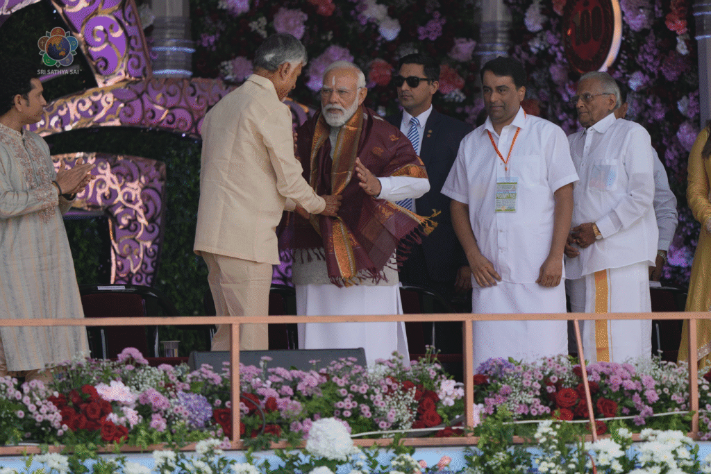El Honorable Primer Ministro de la India visitó Prasanthi Nilayam esta mañana para participar en las celebraciones del centenario de Bhagavan. Primero visitó el Sai Kulwant Hall, donde donó 100 vacas en nombre del fideicomiso. Lo acompañaron el Honorable Ministro Principal de Andhra Pradesh, Sri Chandrababu Naidu, el Viceprimer Ministro de Andhra Pradesh, Sri Konidala Pawan Kalyan, y otras personalidades. Posteriormente, Sri Narendra Modi rindió homenaje al Maha Samadhi de Bhagavan y al altar principal dentro del Bhajan Mandir. Los invitados se dirigieron luego al Estadio Sri Sathya Sai Hill View.
