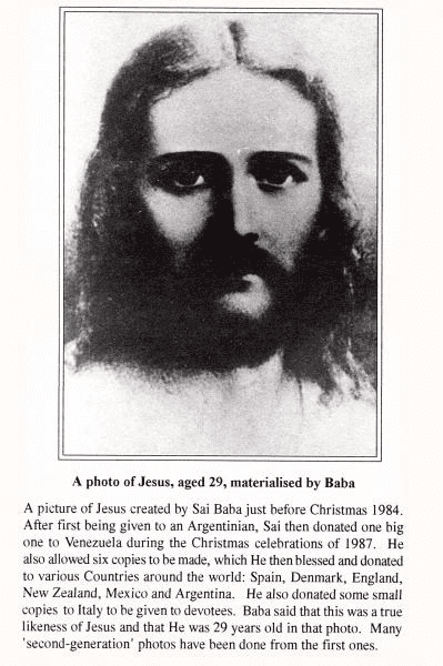 Una imagen de Jesús creada por Sai Baba justo antes de la Navidad de 1984. Tras entregarla primero a un argentino, Sai donó luego una copia grande a Venezuela durante las celebraciones navideñas de 1987. También permitió que se hicieran seis copias, que él mismo bendijo y donó a varios países del mundo: España, Dinamarca, Inglaterra, Nueva Zelanda, México y Argentina. Asimismo, donó algunas copias pequeñas a Italia para ser entregadas a devotos. Baba dijo que esta era una representación verdadera de Jesús y que Él tenía 29 años en esa foto. Se han hecho muchas fotos de “segunda generación” a partir de las primeras.