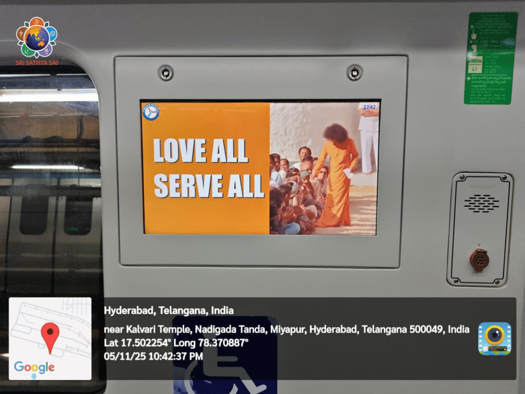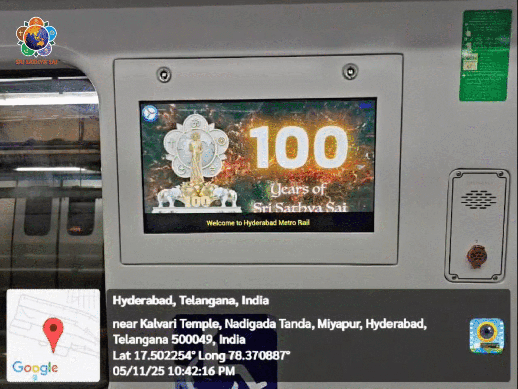 En la sagrada ocasión del Centenario de Bhagawan Sri Sathya Sai Baba, el Metro de Hyderabad (HMRL) ha comenzado a transmitir videos especiales que difunden su mensaje atemporal de amor y servicio, acompañados de bellas imágenes.