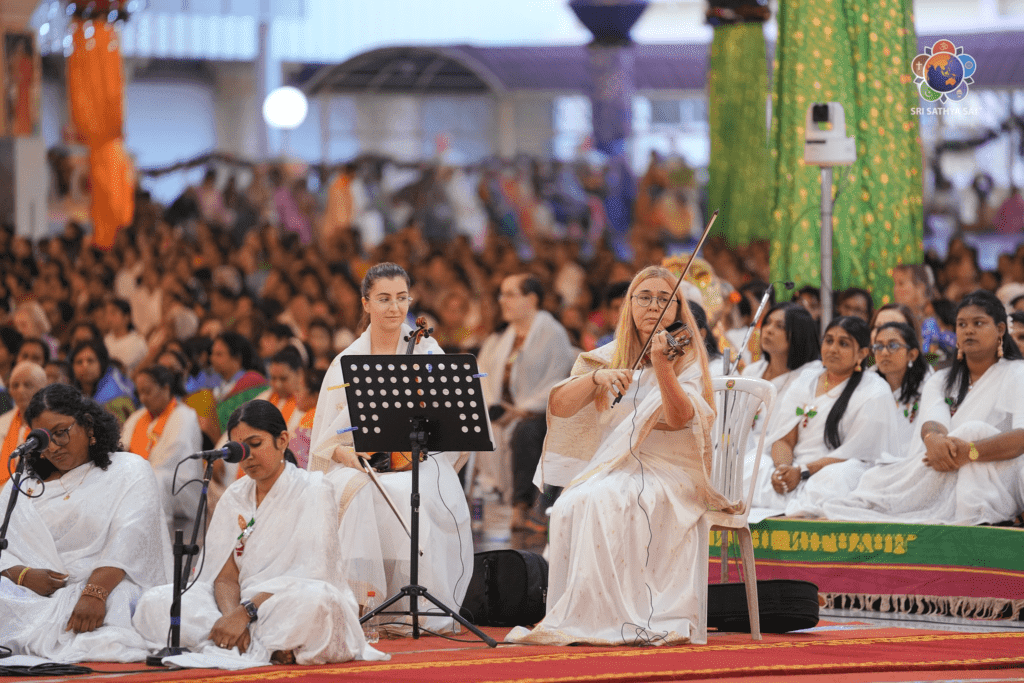 The opening evening witnessed a heart-touching musical offering by devotees of the Sri Sathya Sai Global Council—a soothing fusion concert titled “Harmonies of the Heart Divine.” Blending Western Christmas carols with Indian devotional songs, bhajans and contemplative melodies, the presentation flowed effortlessly across cultures and traditions. The concert concluded with the universal prayer “Samasta Loka Sukhino Bhavantu,” gently reminding all present that beyond boundaries of language, nation or faith, hearts connect most easily through music and loving devotion.