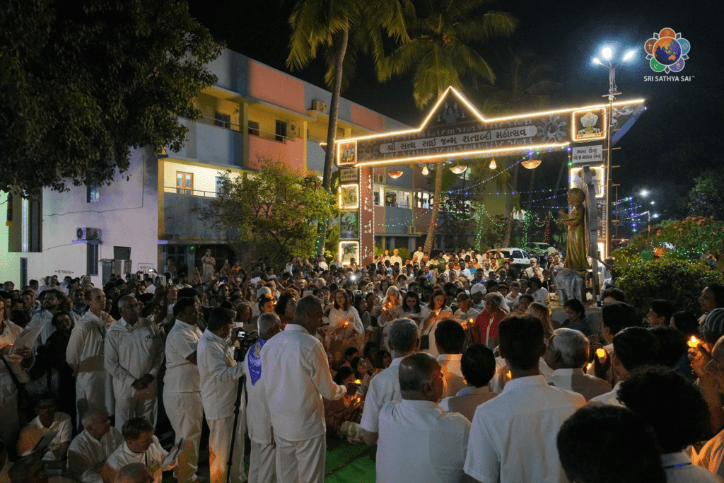 As dusk gently descended upon Prasanthi Nilayam this evening, the Holy Abode seemed to breathe anew, wrapped in the tender joy and sacred warmth of Christmas. The ashram, lovingly adorned, glowed like a serene Bethlehem—quiet yet radiant—ushering in the commencement of the Christmas celebrations. Devotees from across the world, especially members of the Sri Sathya Sai Global Council, came together as one loving family to decorate the ashram for this sacred season. Their collective offering found beautiful expression in creative and elegant lighting that transformed the ashram and Sai Kulwant Hall into a vision reminiscent of grand cathedrals across the world—yet uniquely Sai in spirit. Cascades of light shimmered like prayers rising heavenward, while soft illuminations traced pathways much like stars guiding seekers to the Divine.