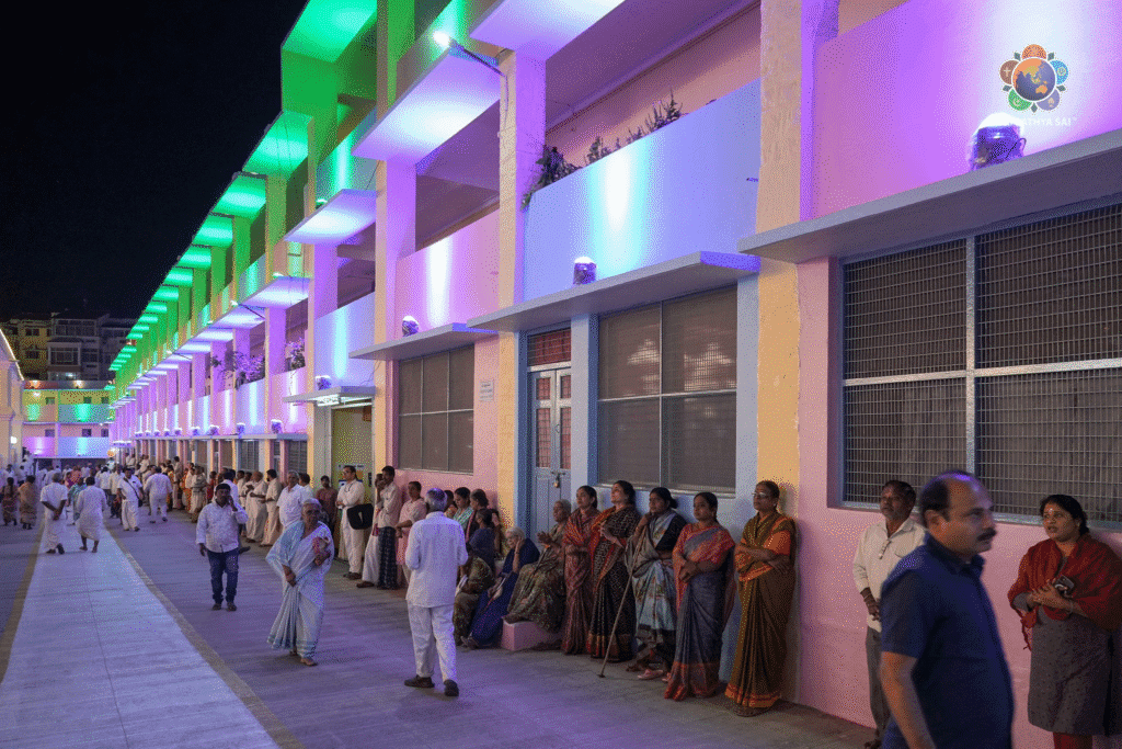 El Ashram, engalanado con vibrantes luces, irradiaba un brillo festivo, y su atmósfera palpitaba con santidad. Los devotos, cautivados por el esplendor, no solo deleitaban sus ojos con la belleza divina, sino que sus almas se nutrían con el incesante fluir de los bhajans. El Sai Kulwant Hall estaba repleto de devotos, muchos de pie en los pasillos, observando con alegría el darshan de Bhagavan en las pantallas LED y uniéndose a los bhajans con profundo fervor, participando de todas las maneras posibles en este evento sagrado.
