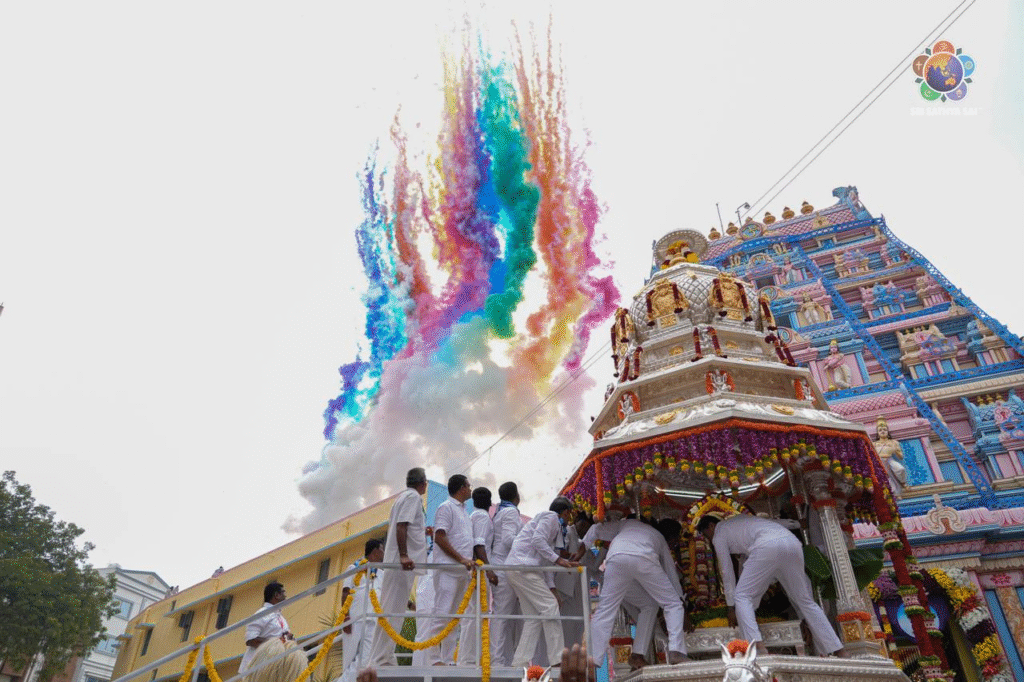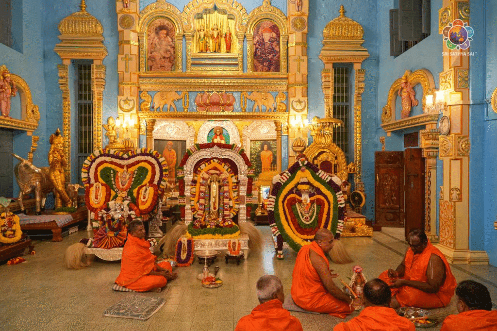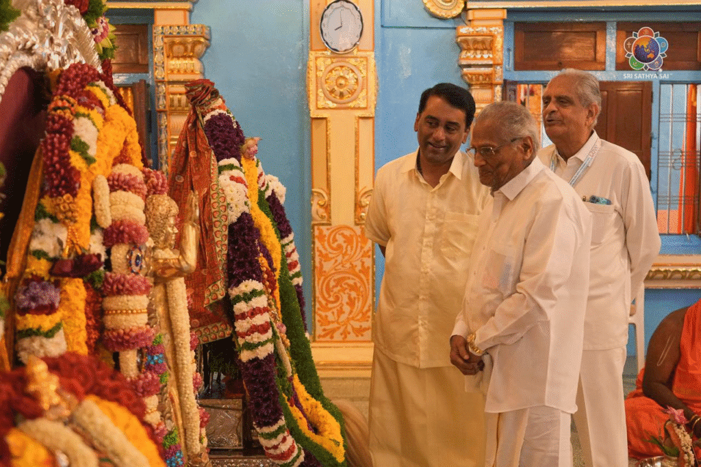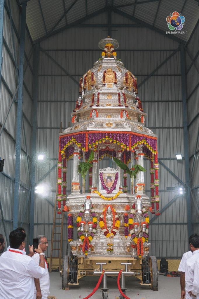 El día comenzó con el Sri Sai Sathya Narayana Vratham, realizado por 1100 parejas en el Sai Kulwant Hall, llenando el espacio sagrado de profunda devoción y reverencia espiritual. A continuación, el Sr. RJ Rathnakar y la Sra. Himavahini Rathnakar oficiaron una puja especial al recién construido Sri Sathya Sai Ratham de Plata, invocando las bendiciones divinas para el auspicioso inicio del Rathotsavam.