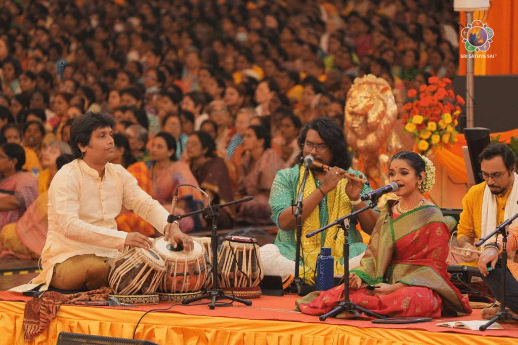 Following the Vedam chanting in the sacred Sai Kulwant Hall, a special musical offering titled “Suranjali” was presented by Mr Abby V and Ms Antara Nandy. The duo rendered a soulful tapestry of devotional melodies—beginning with the iconic “Sathyam Shivam Sundaram,” moving to the mellifluous “Ek Radha Ek Meera,” the timeless Annamacharya Keerthana “Brahmamokkate,” and concluding with stirring Pandhari bhajans. Their heartfelt renditions elevated the ambience, filling hearts with devotion and gently drawing every listener into deep remembrance of Bhagawan.