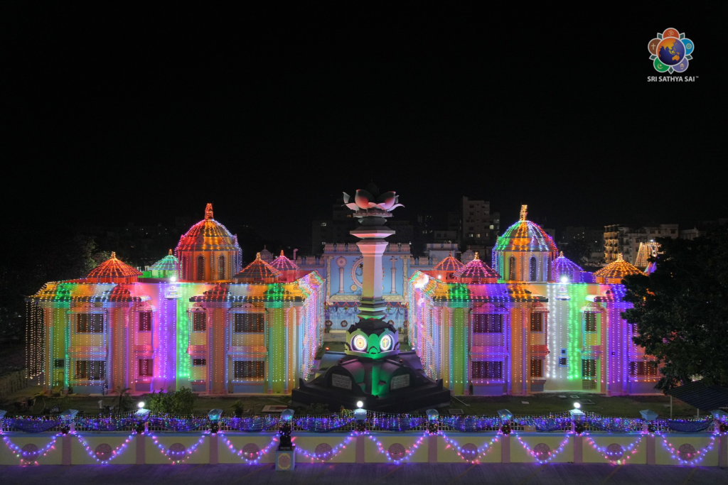 Al caer la tarde suavemente sobre el ashram, Prashanti Nilayam se transforma en una visión de serena festividad. Luces de colores ondean por los senderos y pilares, no con una extravagancia ruidosa, sino con un brillo sereno que refleja la iluminación interior de la que Bhagavan solía hablar. Como estrellas cuidadosamente dispuestas sobre la tierra, las luces parecen susurrar el mensaje navideño que Swami reiteró una y otra vez: «Que la Luz del Amor brille en sus corazones».